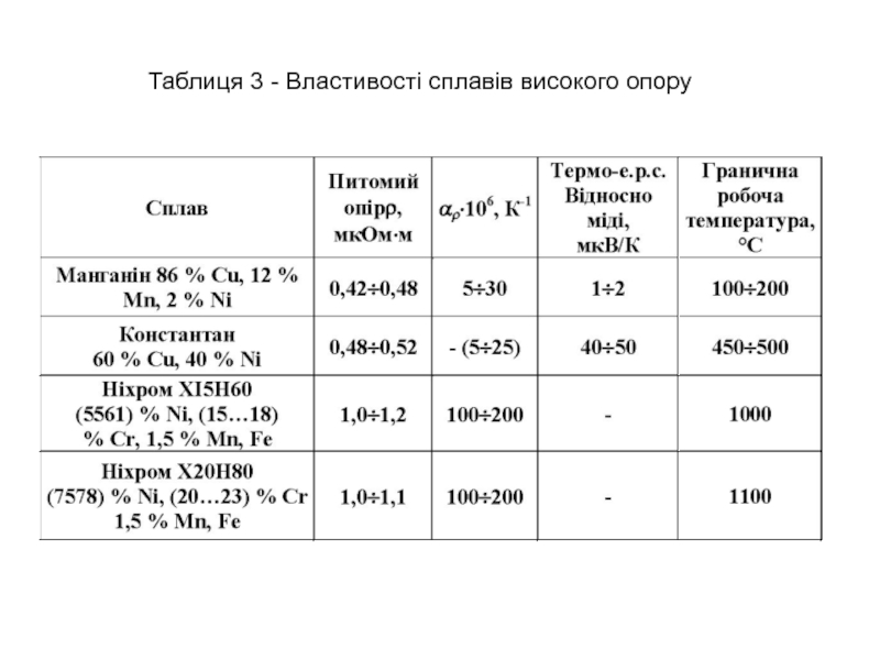 Слайд 32Таблиця 3 - Властивості сплавів високого опору