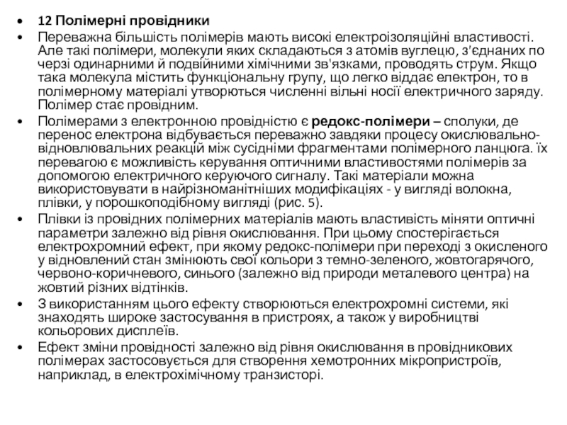 Полімерами з електронною провідністю є редокс-полімери – сполуки, де перенос електрона відбувається переважно завдяки процесу окислювально-відновлювальних реакцій між сусідніми фрагментами полімерного ланцюга. їх перевагою є можливість керування оптичними властивостями полімерів за допомогою електричного керуючого сигналу. Такі матеріали можна використовувати в найрізноманітніших модифікаціях - у вигляді волокна, плівки, у порошкоподібному вигляді (рис. 5).