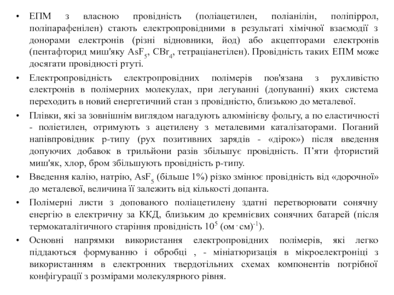 Слайд 23ЕПМ з власною провідність (поліацетилен, поліанілін, поліпіррол, поліпарафенілен) стають електропровідними в