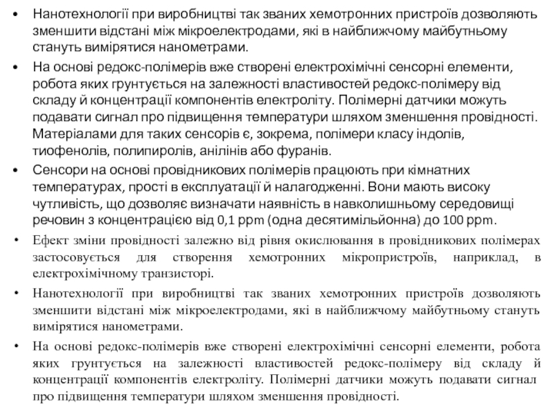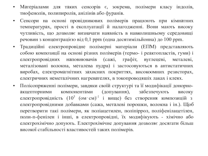 Слайд 22Матеріалами для таких сенсорів є, зокрема, полімери класу індолів, тиофенолів, полипиролів,