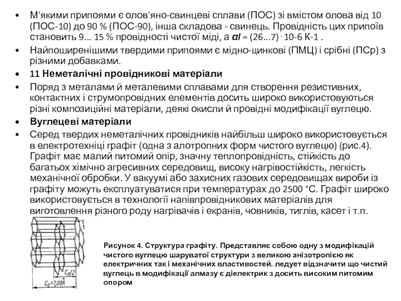 Серед твердих неметалічних провідників найбільш широко використовується в електротехніці графіт (одна з алотропних форм чистого вуглецю) (рис.4). Графіт має малий питомий опір, значну теплопровідність, стійкість до багатьох хімічно агресивних середовищ, високу нагрівостійкість, легкість механічної обробки. У вакуумі або захисних газових середовищах вироби із графіту можуть експлуатуватися при температурах до 2500 °С. Графіт широко використовується в технології напівпровідникових матеріалів для виготовлення різного роду нагрівачів і екранів, човників, тиглів, касет і т.п.