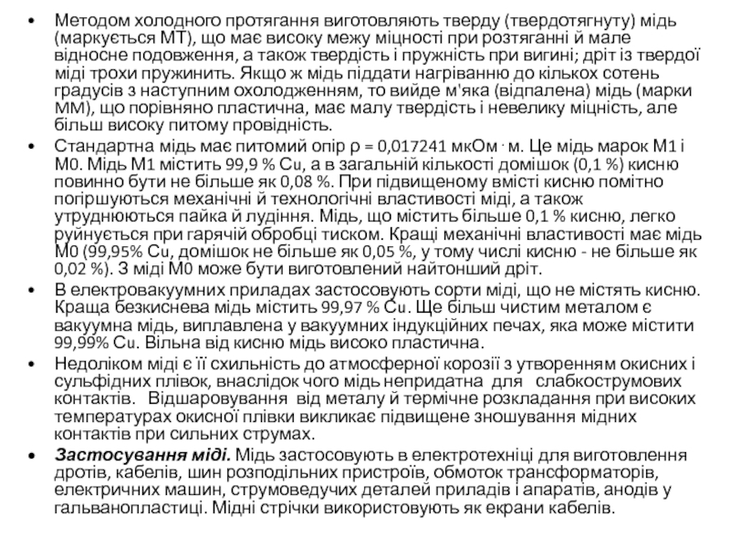 Слайд 3Методом холодного протягання виготовляють тверду (твердотягнуту) мідь (маркується МТ), що має