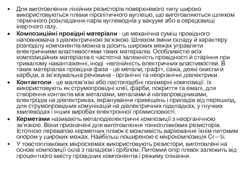 Слайд 18Для виготовлення лінійних резисторів поверхневого типу широко використовуються плівки піролітичного вуглецю,