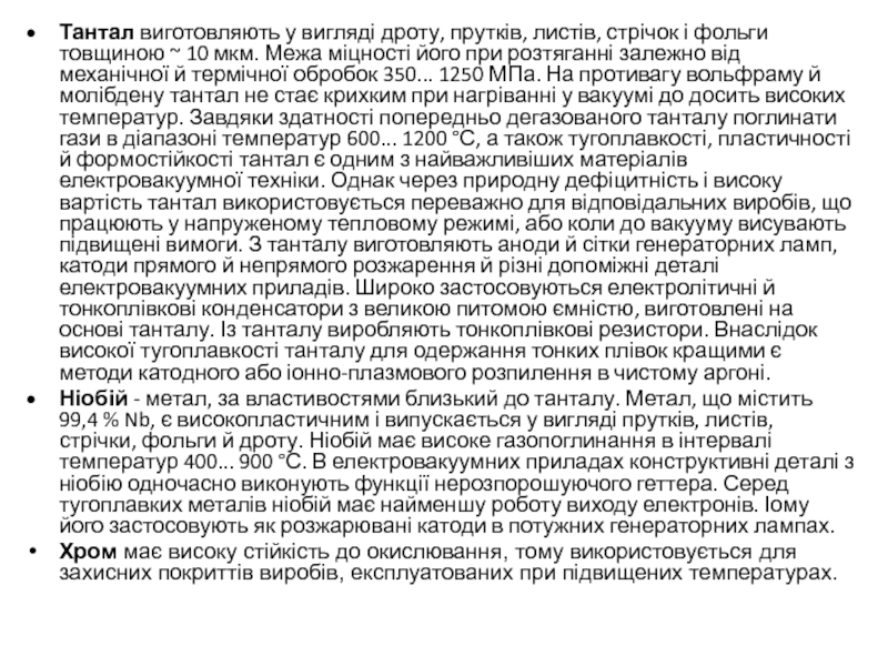 ~ 10 мкм. Межа міцності його при розтяганні залежно від механічної й термічної обробок 350... 1250 МПа. На противагу вольфраму й молібдену тантал не стає крихким при нагріванні у вакуумі до досить високих температур. Завдяки здатності попередньо дегазованого танталу поглинати гази в діапазоні температур 600... 1200 °С, а також тугоплавкості, пластичності й формостійкості тантал є одним з найважливіших матеріалів електровакуумної техніки. Однак через природну дефіцитність і високу вартість тантал використовується переважно для відповідальних виробів, що працюють у напруженому тепловому режимі, або коли до вакууму висувають підвищені вимоги. З танталу виготовляють аноди й сітки генераторних ламп, катоди прямого й непрямого розжарення й різні допоміжні деталі електровакуумних приладів. Широко застосовуються електролітичні й тонкоплівкові конденсатори з великою питомою ємністю, виготовлені на основі танталу. Із танталу виробляють тонкоплівкові резистори. Внаслідок високої тугоплавкості танталу для одержання тонких плівок кращими є методи катодного або іонно-плазмового розпилення в чистому аргоні.
