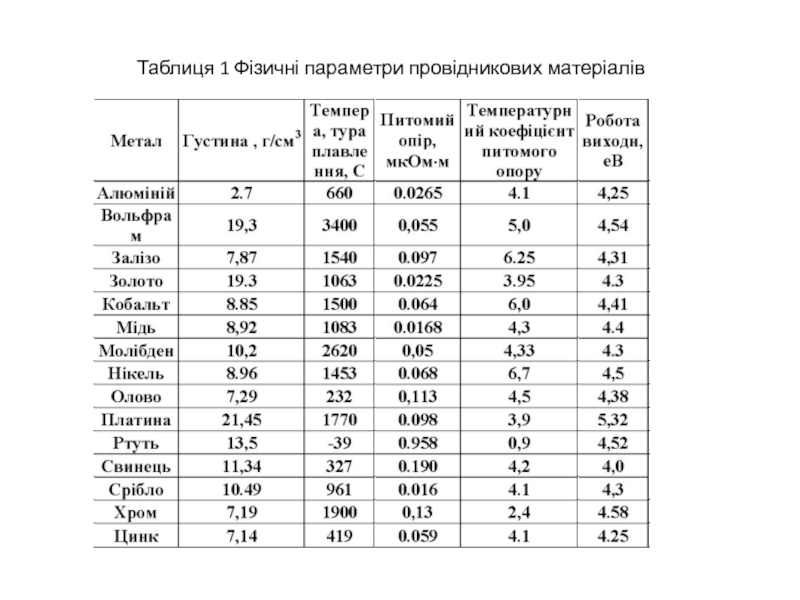 Слайд 30Таблиця 1 Фізичні параметри провідникових матеріалів