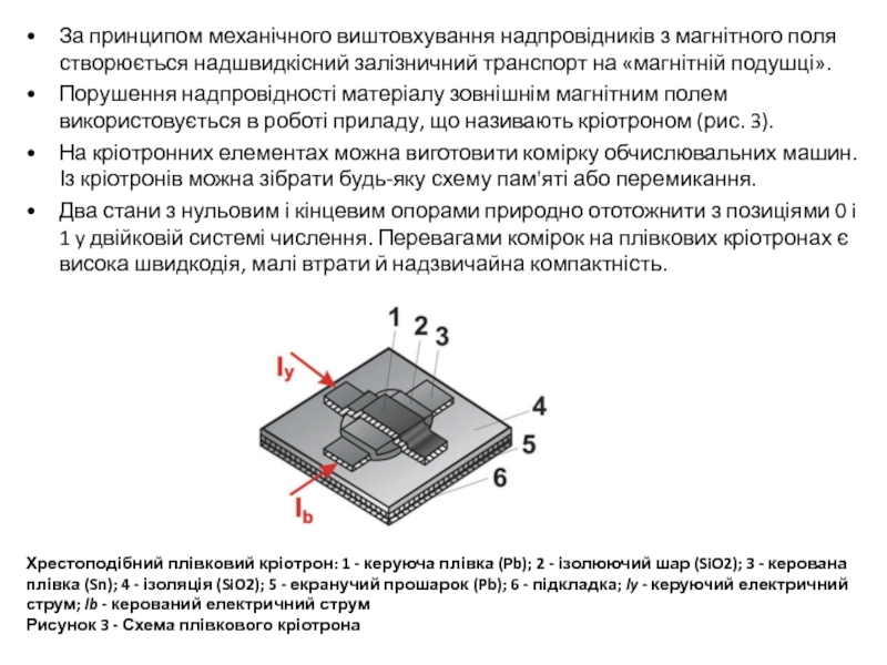 Хрестоподібний плівковий кріотрон: 1 - керуюча плівка (Pb); 2 - ізолюючий шар (SiO2); 3 - керована плівка (Sn); 4 - ізоляція (SiO2); 5 - екранучий прошарок (Pb); 6 - підкладка; ly - керуючий електричний струм; lb - керований електричний струм