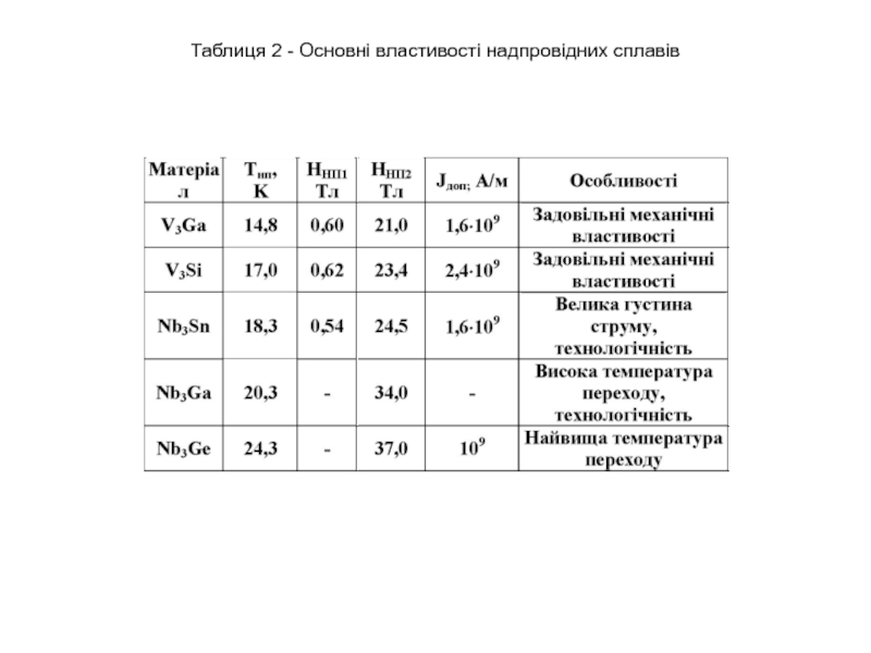 Слайд 31Таблиця 2 - Основні властивості надпровідних сплавів