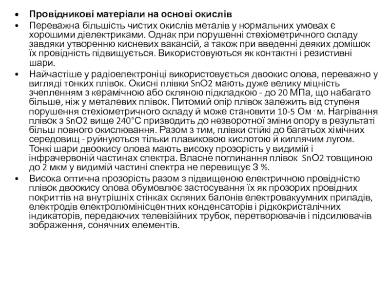 Найчастіше у радіоелектроніці використовується двоокис олова, переважно у вигляді тонких плівок. Окисні плівки SnО2 мають дуже велику міцність зчепленням з керамічною або скляною підкладкою - до 20 МПа, що набагато більше, ніж у металевих плівок. Питомий опір плівок залежить від ступеня порушення стехіометричного складу й може становити 10-5 Ом⋅м. Нагрівання плівок з SnО2 вище 240°С призводить до незворотної зміни опору в результаті більш повного окислювання. Разом з тим, плівки стійкі до багатьох хімічних середовищ - руйнуються тільки плавиковою кислотою й киплячим лугом. Тонкі шари двоокису олова мають високу прозорість у видимій і інфрачервоній частинах спектра. Власне поглинання плівок SnО2 товщиною до 2 мкм у видимій частині спектра не перевищує З %.