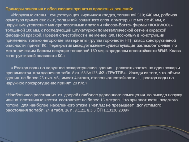 Слайд 8Примеры описания и обоснования принятых проектных решений: