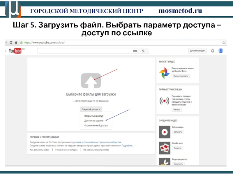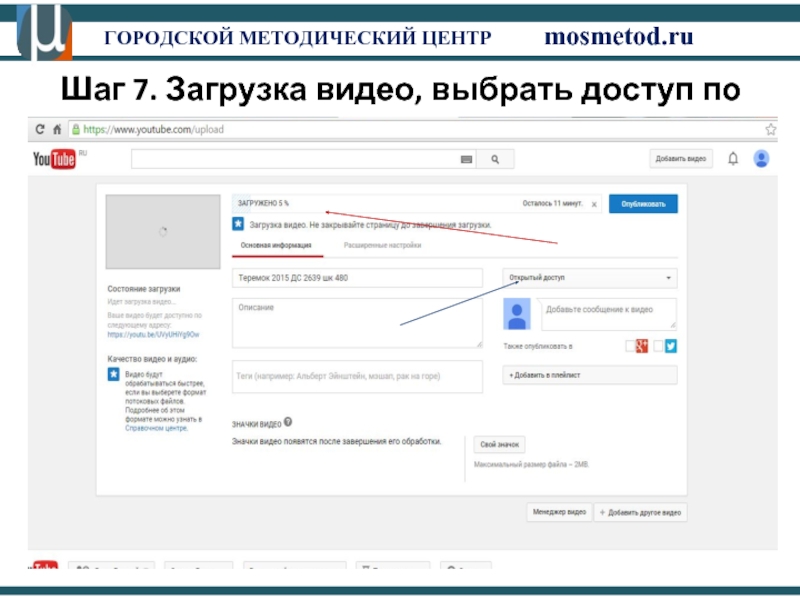 Шаг 7. Загрузка видео, выбрать доступ по ссылке