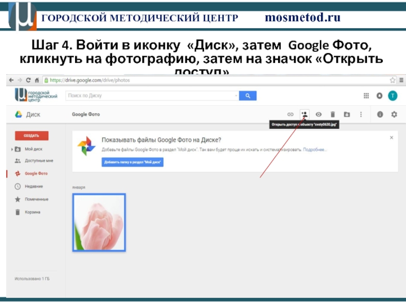 кликнуть на фотографию, затем на значок «Открыть доступ»
