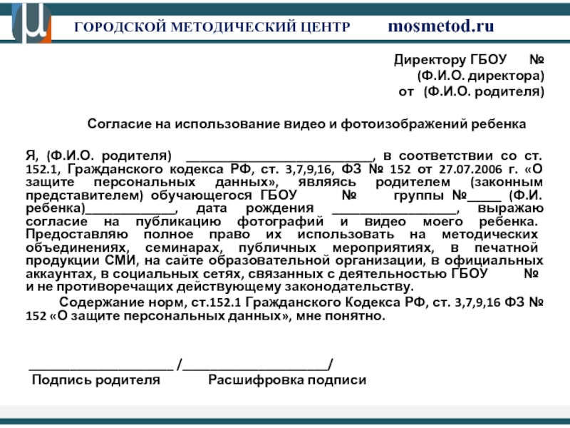 Я, (Ф.И.О. родителя) ___________________________, в соответствии со ст. 152.1, Гражданского кодекса РФ, ст. 3,7,9,16, ФЗ № 152 от 27.07.2006 г. «О защите персональных данных», являясь родителем (законным представителем) обучающегося ГБОУ   №   группы №_____ (Ф.И. ребенка)_____________, дата рождения __________________, выражаю согласие на публикацию фотографий и видео моего ребенка. Предоставляю полное право их использовать на методических объединениях, семинарах, публичных мероприятиях, в печатной продукции СМИ, на сайте образовательной организации, в официальных аккаунтах, в социальных сетях, связанных с деятельностью ГБОУ     №    и не противоречащих действующему законодательству.