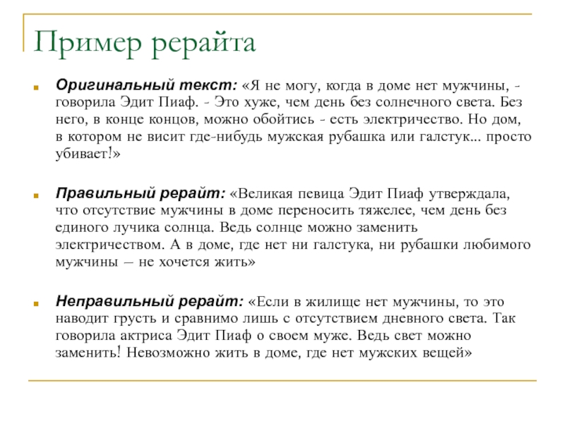 Неправильный рерайт: «Если в жилище нет мужчины, то это наводит грусть и сравнимо лишь с отсутствием дневного света. Так говорила актриса Эдит Пиаф о своем муже. Ведь свет можно заменить! Невозможно жить в доме, где нет мужских вещей»