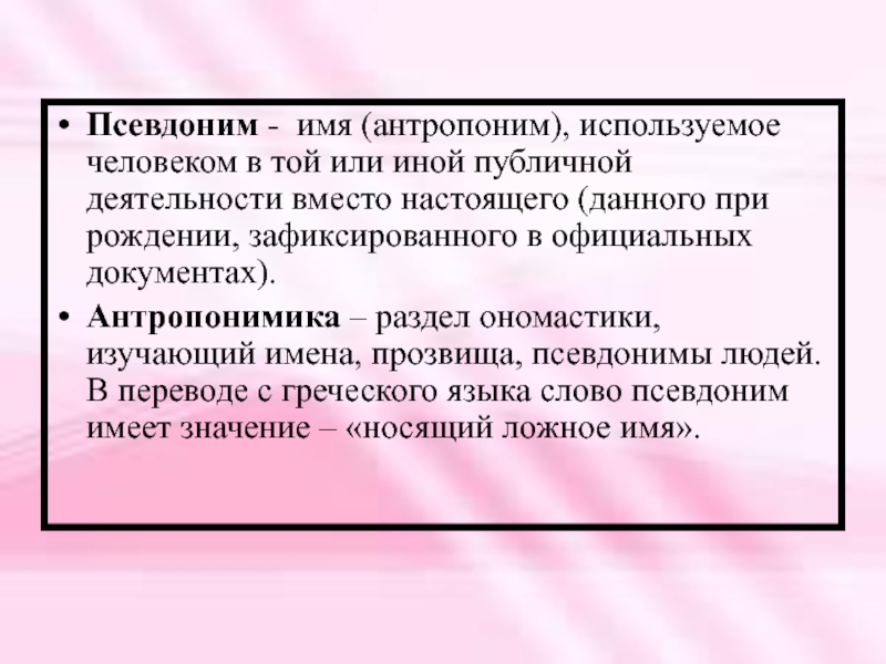 Антропонимика – раздел ономастики, изучающий имена, прозвища, псевдонимы людей. В переводе с греческого языка слово псевдоним имеет значение – «носящий ложное имя».