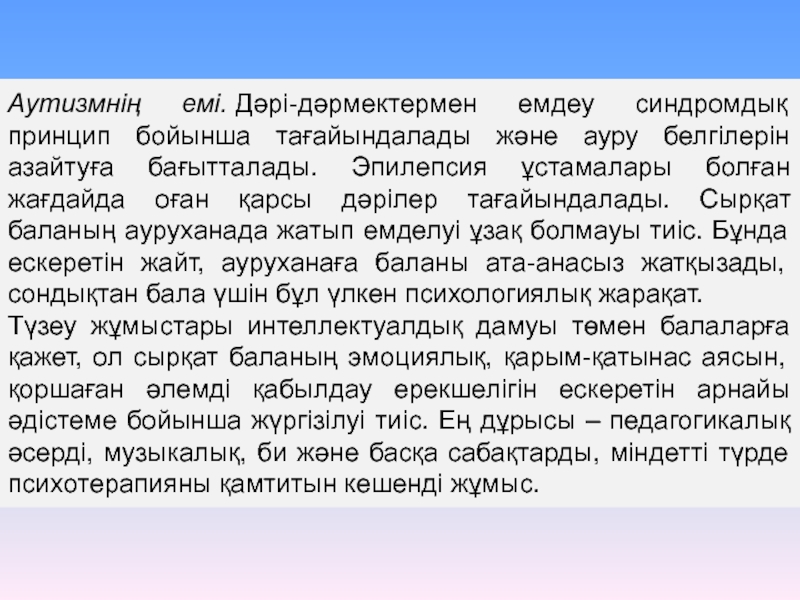 Слайд 9Аутизмнің емі. Дәрі-дәрмектермен емдеу синдромдық принцип бойынша тағайындалады және ауру белгілерін азайтуға