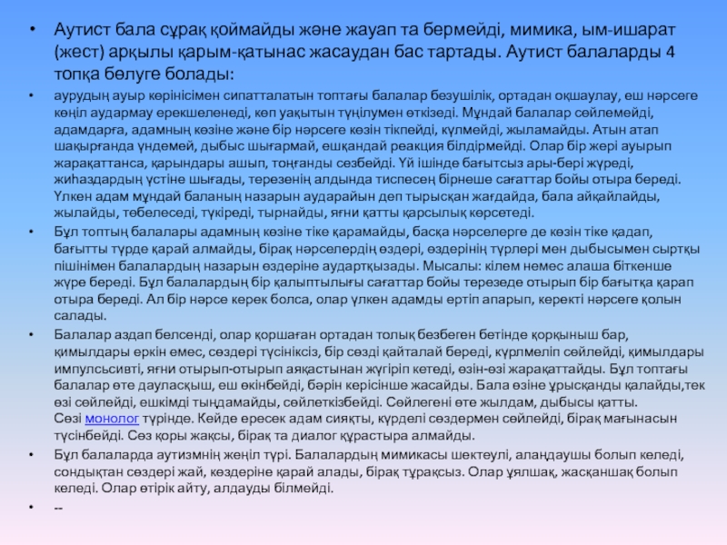 Слайд 7Аутист бала сұрақ қоймайды және жауап та бермейді, мимика, ым-ишарат (жест)