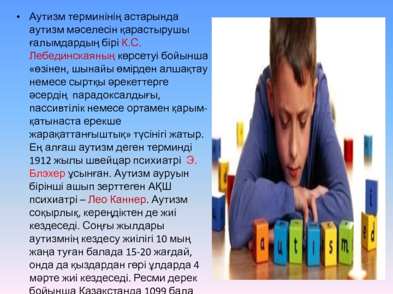 Слайд 4Аутизм терминінің астарында аутизм мәселесін қарастырушы ғалымдардың бірі К.С.Лебединскаяның көрсетуі бойынша