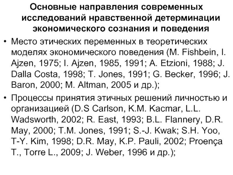 этических переменных в теоретических моделях экономического поведения (M. Fishbein, I. Ajzen, 1975; I. Ajzen, 1985, 1991; A. Etzioni, 1988; J. Dalla Costa, 1998; T. Jones, 1991; G. Becker, 1996; J. Baron, 2000; М. Altman, 2005 и др.);