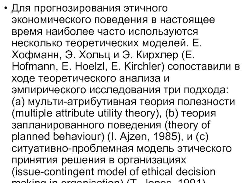 несколько теоретических моделей. Е. Хофманн, Э. Хольц и Э. Кирхлер (E. Hofmann, E. Hoelzl, E. Kirchler) сопоставили в ходе теоретического анализа и эмпирического исследования три подхода: (a) мульти-атрибутивная теория полезности (multiple attribute utility theory), (b) теория запланированного поведения (theory of planned behaviour) (I. Ajzen, 1985), и (c) ситуативно-проблемная модель этического принятия решения в организациях (issue-contingent model of ethical decision making in organisation) (T. Jones, 1991).