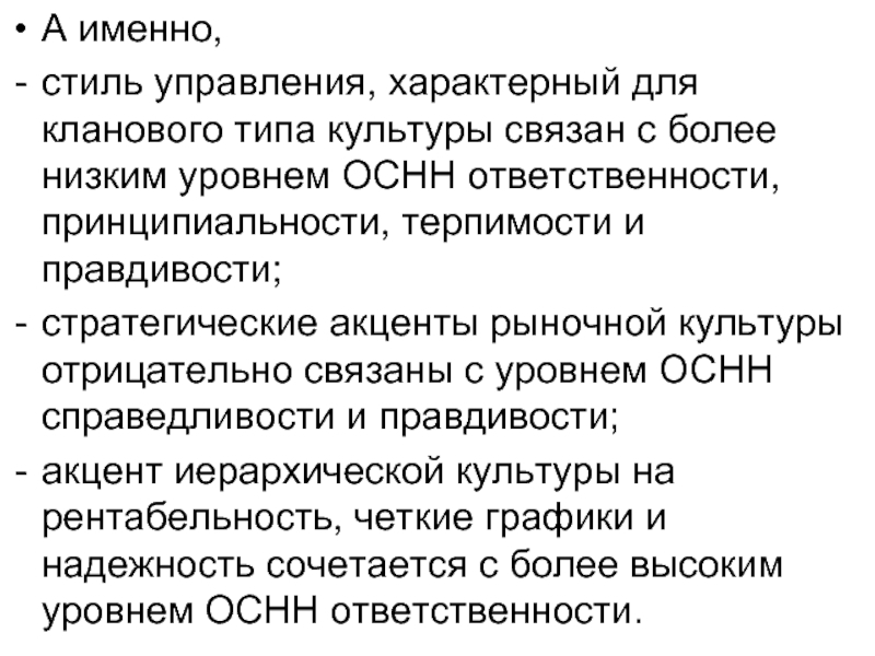 акцент иерархической культуры на рентабельность, четкие графики и надежность сочетается с более высоким уровнем ОСНН ответственности.