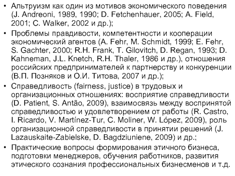 Проблемы правдивости, компетентности и кооперации экономический агентов (A. Fehr, M. Schmidt, 1999; E. Fehr, S. Gachter, 2000; R.H. Frank, T. Gilovitch, D. Regan, 1993; D. Kahneman, J.L. Knetch, R.H. Thaler, 1986 и др.), отношения российских предпринимателей к партнерству и конкуренции (В.П. Позняков и О.И. Титова, 2007 и др.);