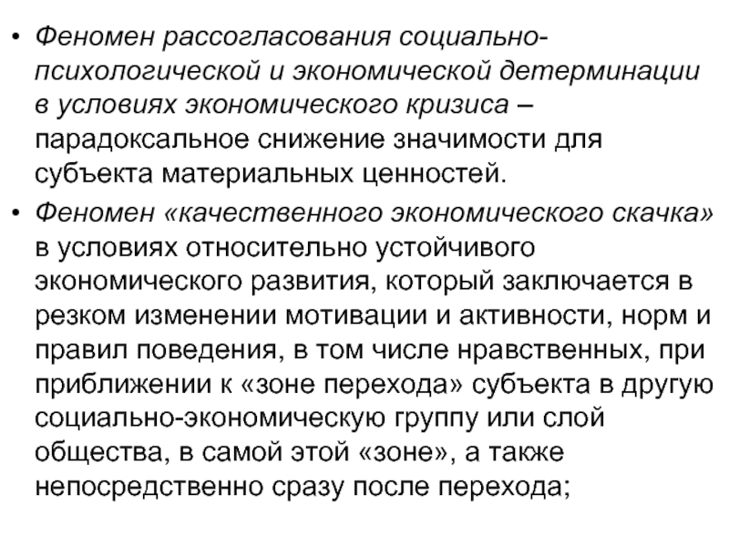 Слайд 66Феномен рассогласования социально-психологической и экономической детерминации в условиях экономического кризиса –