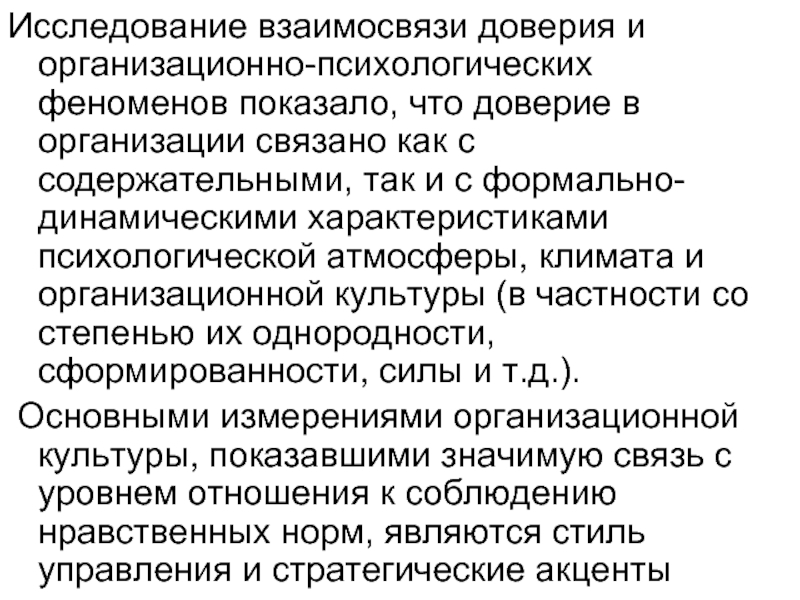 Слайд 52Исследование взаимосвязи доверия и организационно-психологических феноменов показало, что доверие в организации