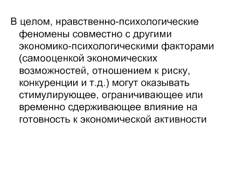 В целом, нравственно-психологические феномены совместно с другими экономико-психологическими факторами (самооценкой экономических
