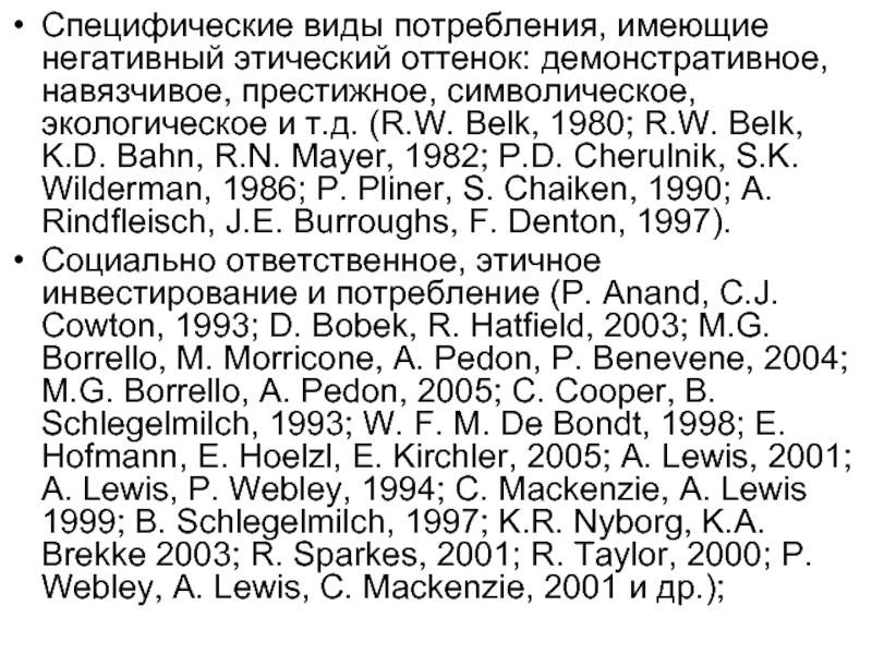 экологическое и т.д. (R.W. Belk, 1980; R.W. Belk, K.D. Bahn, R.N. Mayer, 1982; P.D. Cherulnik, S.K. Wilderman, 1986; P. Pliner, S. Chaiken, 1990; A. Rindfleisch, J.E. Burroughs, F. Denton, 1997).