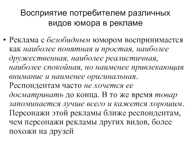 наиболее оригинальная, довольно дружеская и нереальная. Однако продукт в рекламе этого вида запоминается хуже всего. Важно также, что товар кажется хорошим в меньшей степени, чем в товар в рекламе с агрессивным и безобидным юмором