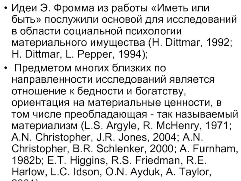 исследований в области социальной психологии материального имущества (H. Dittmar, 1992; H. Dittmar, L. Pepper, 1994);