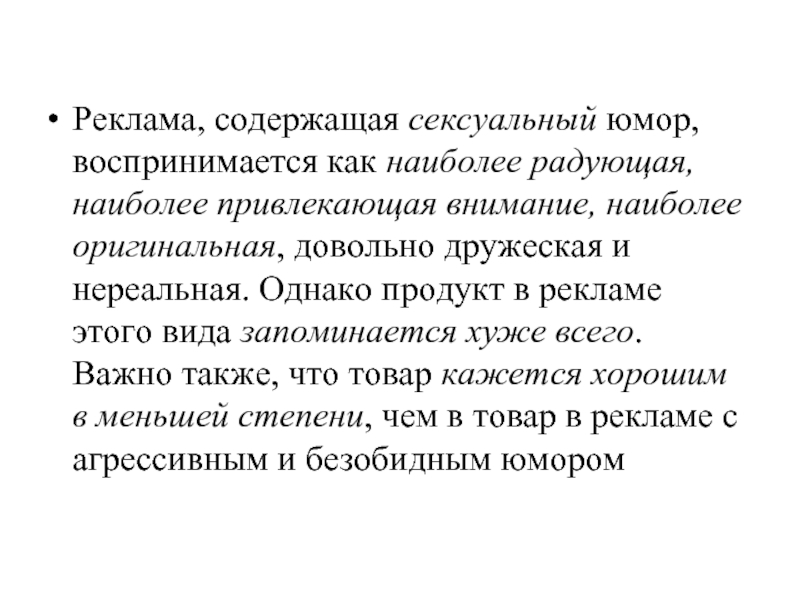 Слайд 61Реклама, содержащая сексуальный юмор, воспринимается как наиболее радующая, наиболее привлекающая внимание,