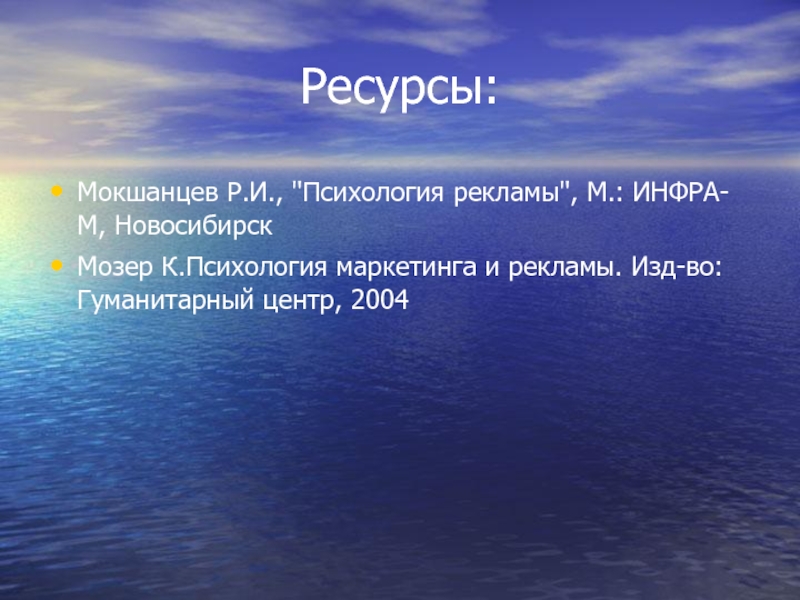 Мокшанцев Р.И., "Психология рекламы", М.: ИНФРА-М, Новосибирск