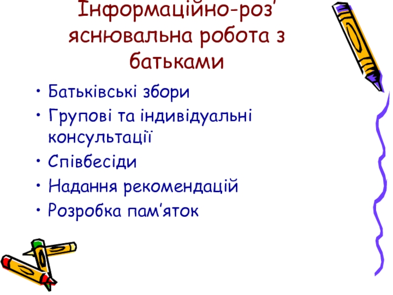 Слайд 19Інформаційно-роз’яснювальна робота з батьками