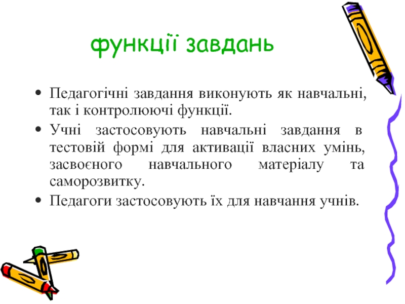 Слайд 10Педагогічні завдання виконують як навчальні, так і контролюючі функції.