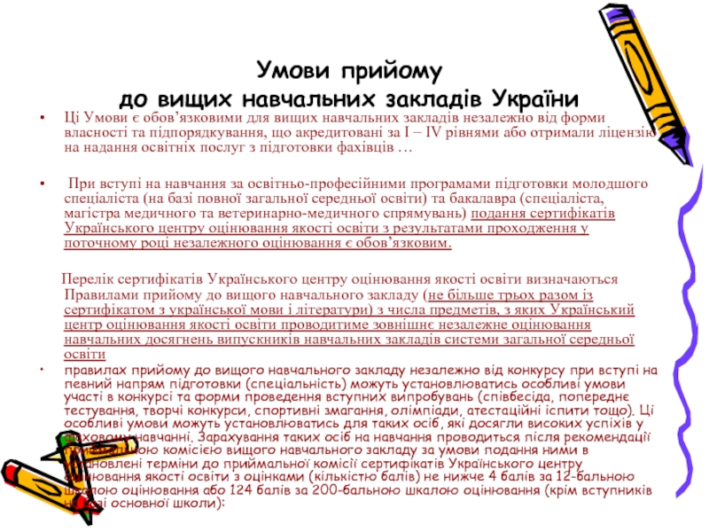 При вступі на навчання за освітньо-професійними програмами підготовки молодшого спеціаліста (на базі повної загальної середньої освіти) та бакалавра (спеціаліста, магістра медичного та ветеринарно-медичного спрямувань) подання сертифікатів Українського центру оцінювання якості освіти з результатами проходження у поточному році незалежного оцінювання є обов’язковим.