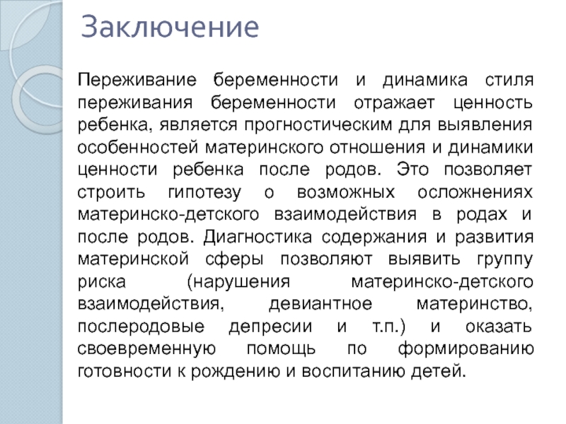 прогностическим для выявления особенностей материнского отношения и динамики ценности ребенка после родов. Это позволяет строить гипотезу о возможных осложнениях материнско-детского взаимодействия в родах и после родов. Диагностика содержания и развития материнской сферы позволяют выявить группу риска (нарушения материнско-детского взаимодействия, девиантное материнство, послеродовые депресии и т.п.) и оказать своевременную помощь по формированию готовности к рождению и воспитанию детей.