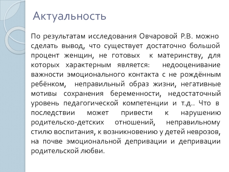 большой процент женщин, не готовых к материнству, для которых характерным является: недооценивание важности эмоционального контакта с не рождённым ребёнком, неправильный образ жизни, негативные мотивы сохранения беременности, недостаточный уровень педагогической компетенции и т.д.. Что в последствии может привести к нарушению родительско-детских отношений, неправильному стилю воспитания, к возникновению у детей неврозов, на почве эмоциональной депривации и депривации родительской любви.