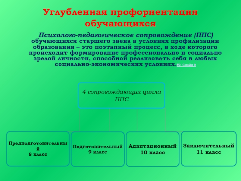 в условиях профилизации образования – это поэтапный процесс, в ходе которого происходит формирование профессионально и социально зрелой личности, способной реализовать себя в любых социально-экономических условиях.#9. Слайд 9
