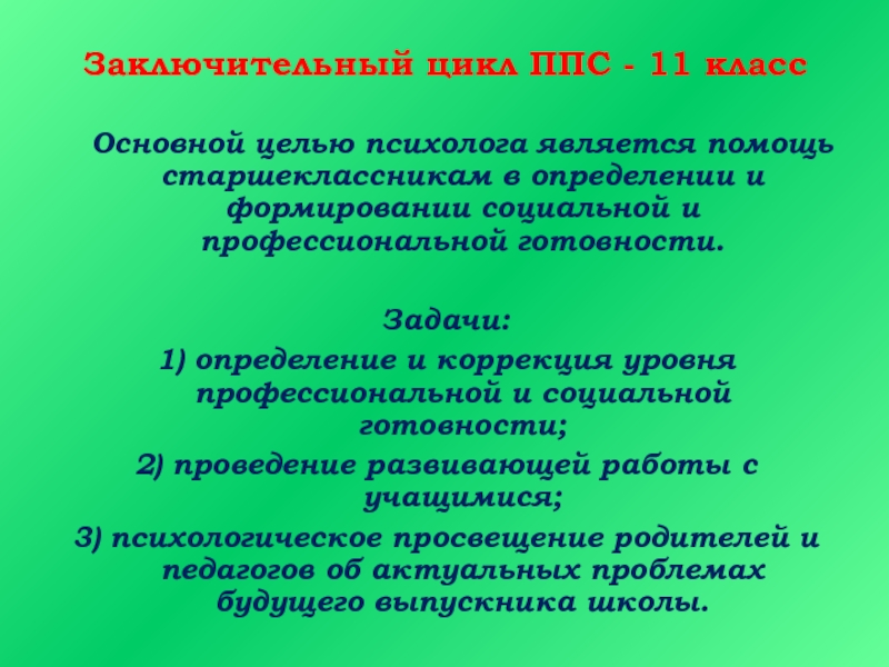 3) психологическое просвещение родителей и педагогов об актуальных проблемах будущего выпускника школы.