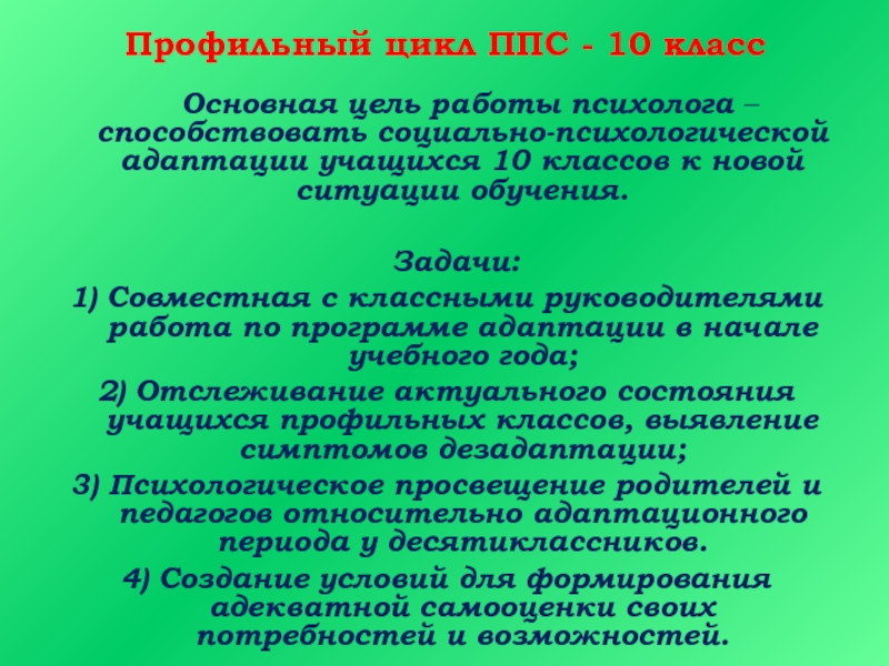 психолога – способствовать социально-психологической адаптации учащихся 10 классов к новой ситуации обучения.