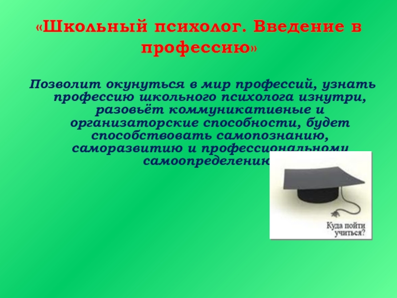 школьного психолога изнутри, разовьёт коммуникативные и организаторские способности, будет способствовать самопознанию, саморазвитию и профессиональному самоопределению.