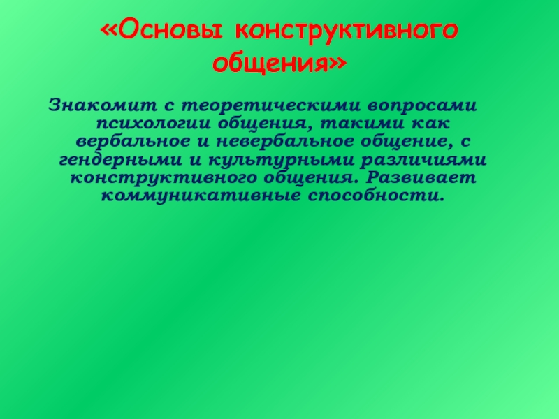 и невербальное общение, с гендерными и культурными различиями конструктивного общения. Развивает коммуникативные способности.