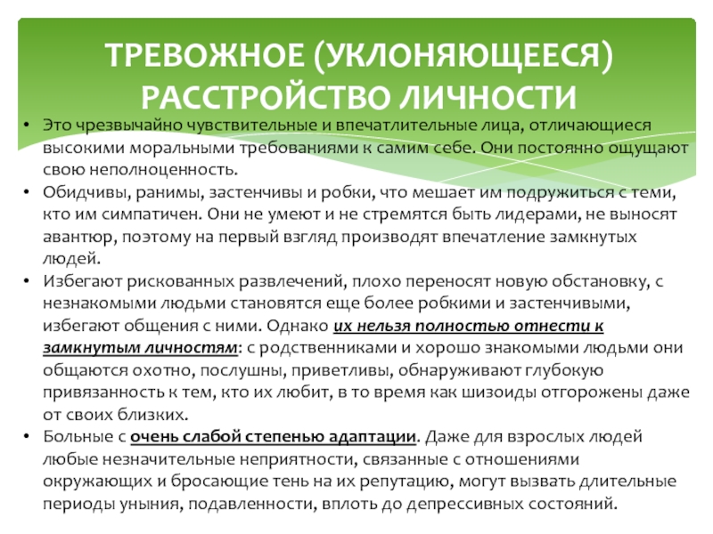 Слайд 69ТРЕВОЖНОЕ (УКЛОНЯЮЩЕЕСЯ) РАССТРОЙСТВО ЛИЧНОСТИ