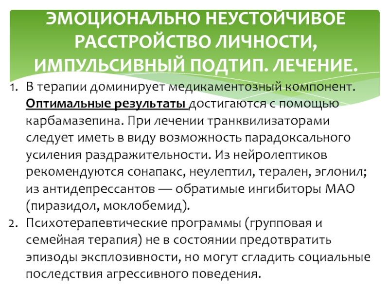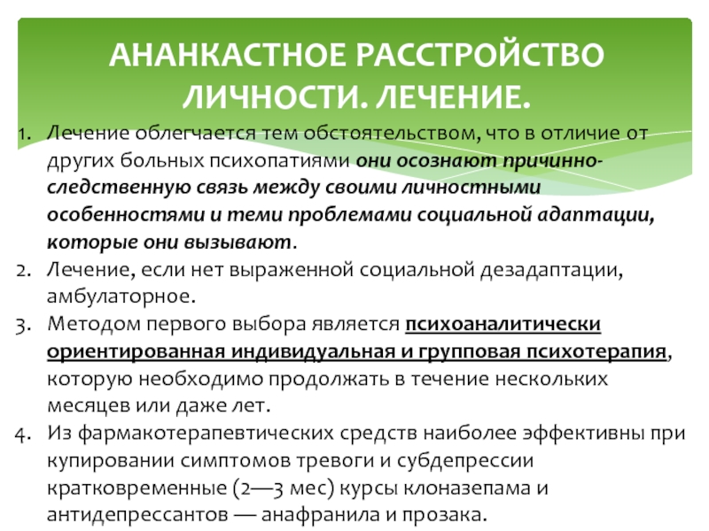Слайд 67АНАНКАСТНОЕ РАССТРОЙСТВО ЛИЧНОСТИ. ЛЕЧЕНИЕ.
