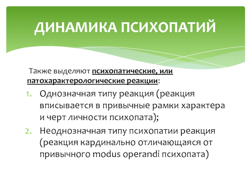 Слайд 77 Также выделяют психопатические, или патохарактерологические реакции:
