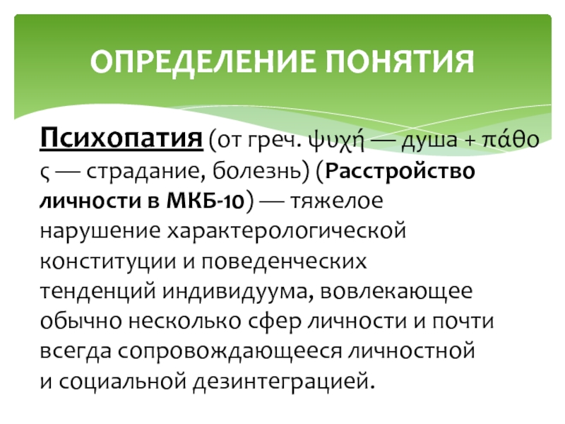 Слайд 17Психопатия (от греч. ψυχή — душа + πάθος — страдание, болезнь) (Расстройство личности в МКБ-10) — тяжелое нарушение характерологической конституции и поведенческих тенденций индивидуума,