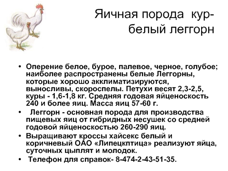 Леггорн - основная порода для производства пищевых яиц от гибридных несушек со средней годовой яйценоскостью 260-290 яиц.