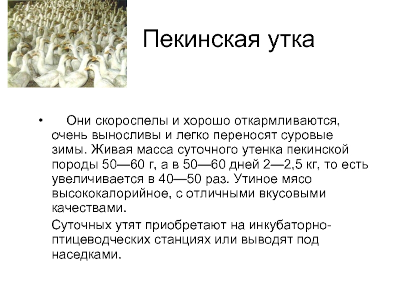 Формирование мясной продуктивности у гусей заканчивается обычно к 8—9-недельному возрасту, когда их мясо наиболее вкусно и питательно.