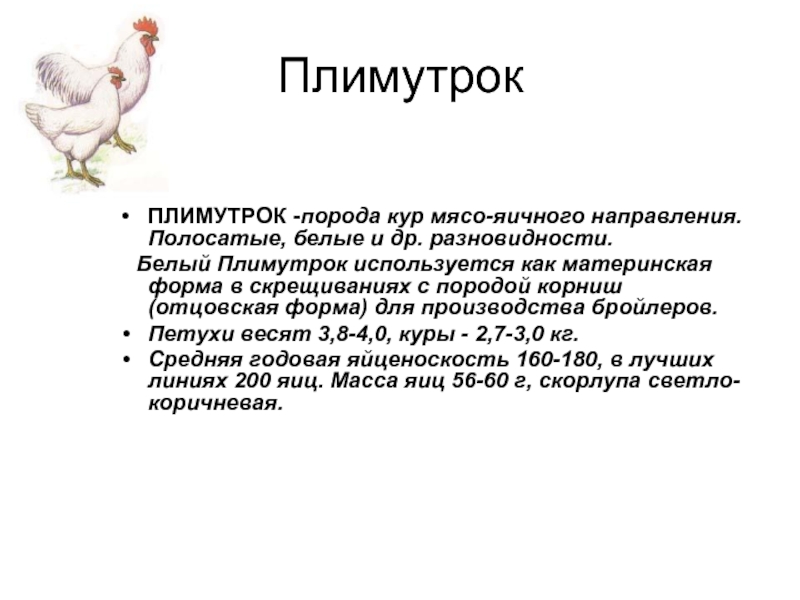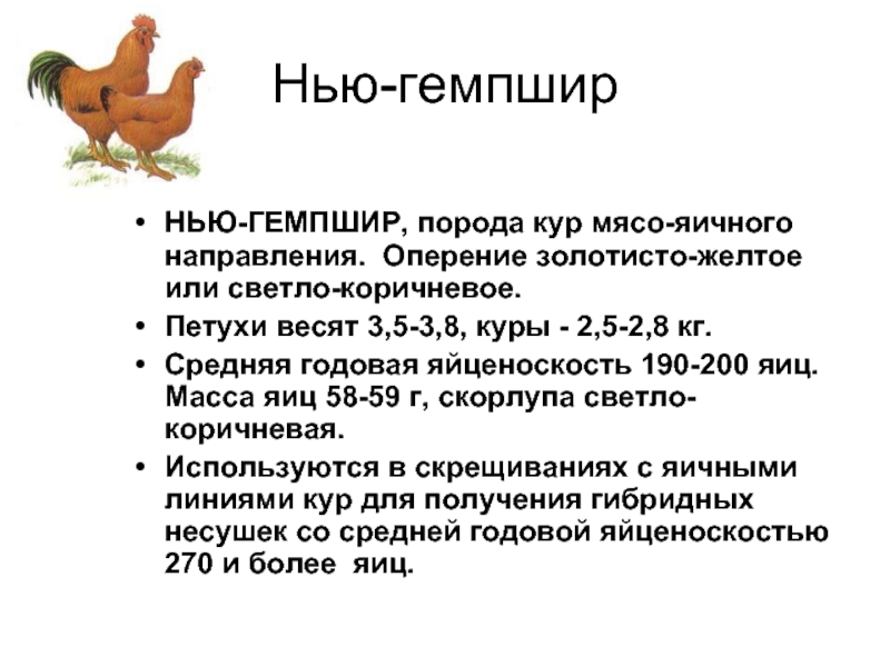 Оперение белое, бурое, палевое, черное, голубое; наиболее распространены белые Леггорны, которые хорошо акклиматизируются, выносливы, скороспелы. Петухи весят 2,3-2,5, куры - 1,6-1,8 кг. Средняя годовая яйценоскость 240 и более яиц. Масса яиц 57-60 г.